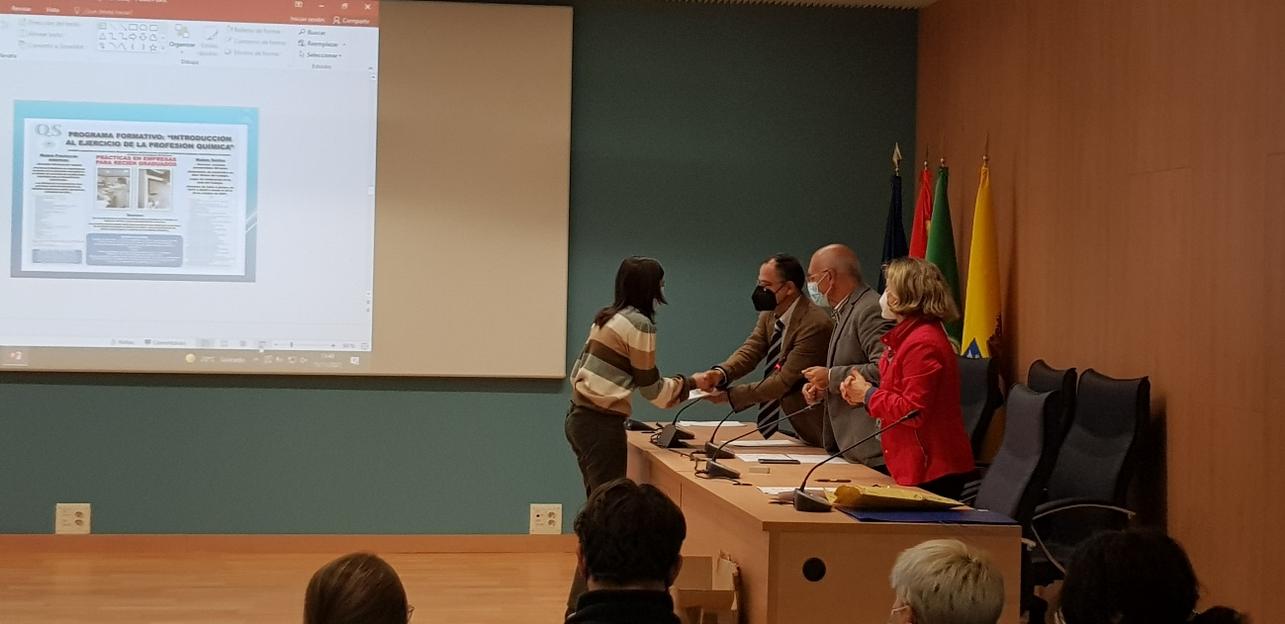 En dicho acto se hizo entrega del reconocimiento a la alumna Dña. Lucía Mancebo Hernández, por tener el mejor expediente de acceso a los estudios del Grado en Química en el curso 2021-2022 en la Facultad de Ciencias. También se realizó la imposición de la insignia por sus Bodas de Oro con la profesión a la colegiada Dña. Concepción de Antonio Gallego.